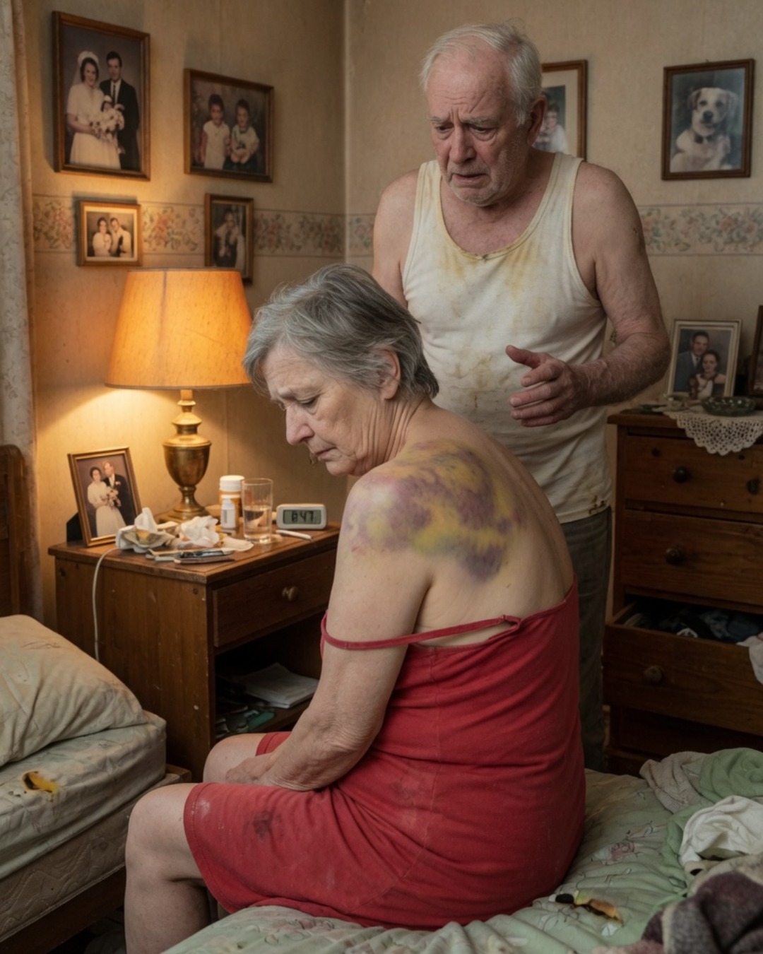 The lamp beside the bed hummed faintly, casting a yellow circle over the carpet where my red dress had fallen.