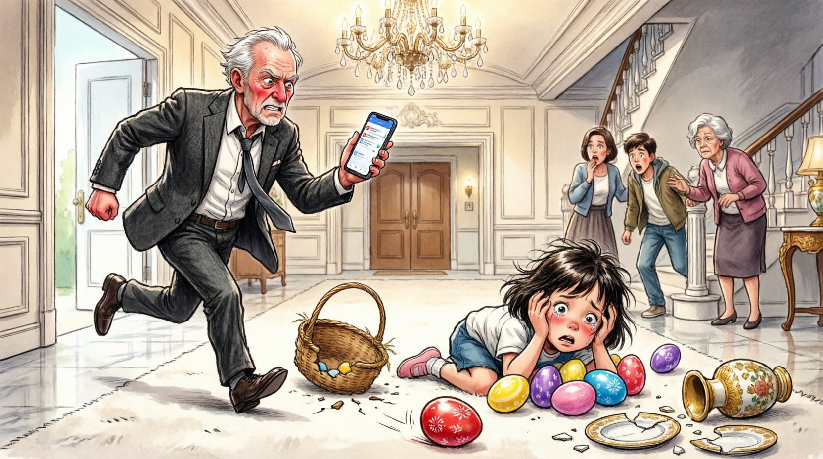 But in the absolute center of the room, lying in a broken, unnatural heap on a massive, expensive white Persian rug, was a sight that made a father’s heart stop beating.