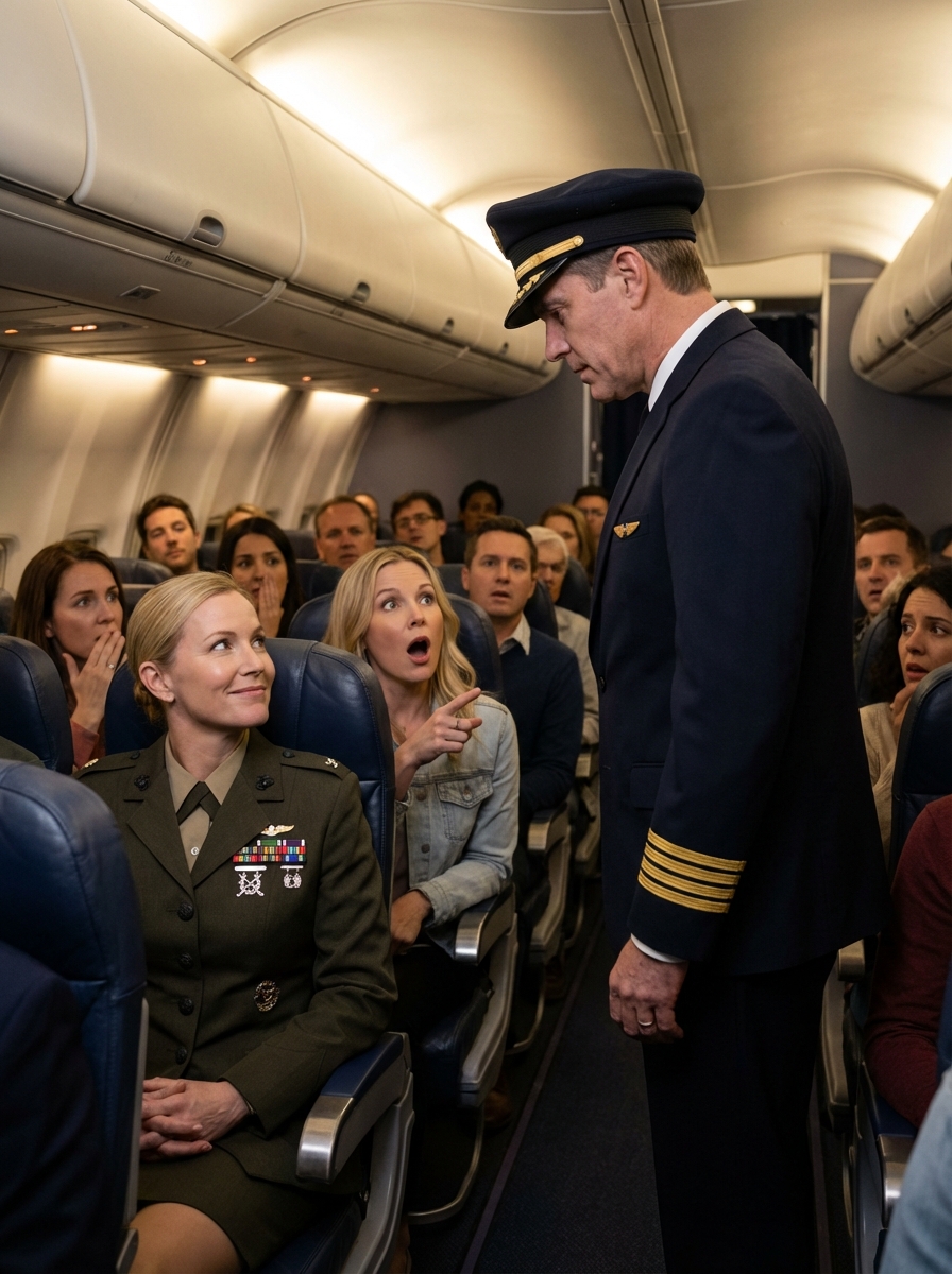 The captain stopped beside my economy seat, and saluted. “General, ma’am.” In one second, the laughter died, my father’s grin …..